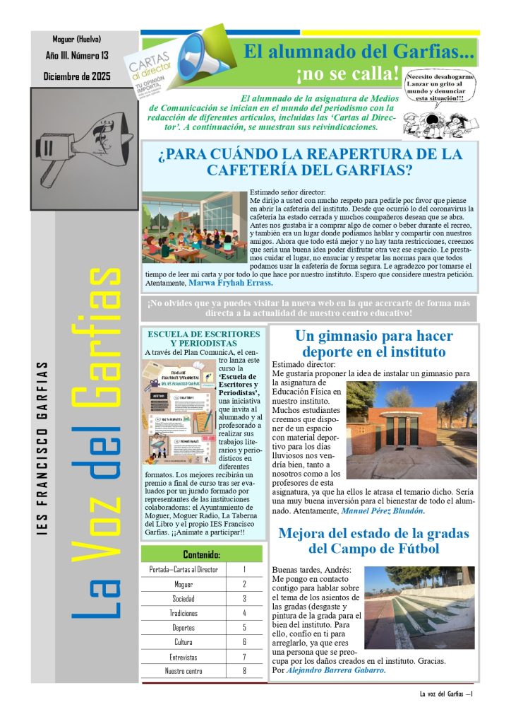 El alumnado de 4º de ESO matriculado en la optativa Medios de Comunicación se encarga de elaborar esta publicación trimestral que recoge noticias del centro y de la localidad, así como, entrevistas y reportajes sobre temas de actualidad.